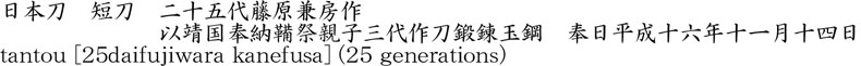 ![]() 短刀 龍神住源貞茂作 (龍神太郎源貞茂) 平成二年三月日 tantou [ryujin-ju minamoto sadashige saku HEISEI 27] (ryujintarou sadashige) |
