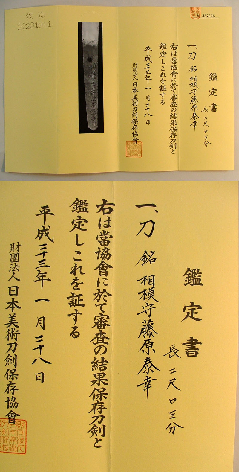 【コメント】 相模守藤原泰幸は能登守藤原泰幸の子で本国は美濃。 尾張は美濃と隣接し刀工の移住が多くそれらを尾張関と称し、中でも政常、氏房、信高、泰幸が有名で、美濃本国とやや趣を異にする独自の作品を残した事により、昔から剣界の玄人筋に人気があったと言われています。 |