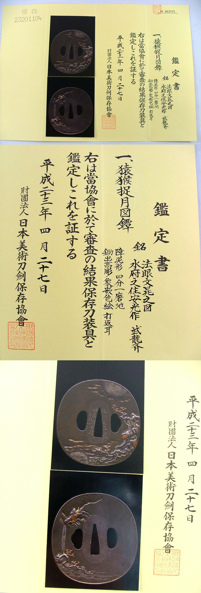 猿猴捉月図鍔 法眼文晁之図 水府之住安光作 武龍斉