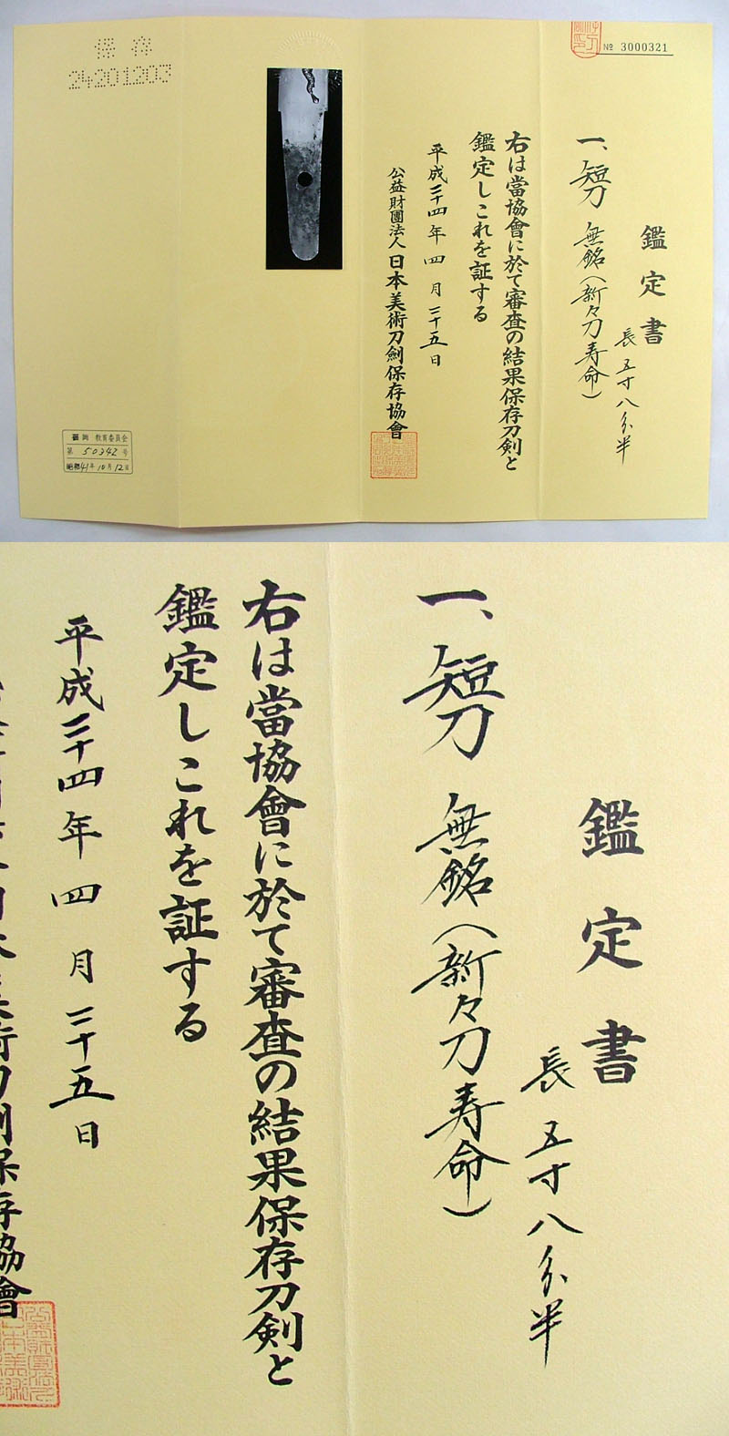 【コメント】 「寿命」は元は大和系の鍛冶で鎌倉時代に始まると云われ、代々「寿命」と切り古刀期の作の殆どは天文頃の美濃の作とされています。 またその作域の広いことから無銘物の極めとしても良く経眼します。 その名前の良いことから武家の祝儀用差料として喜ばれました。 |